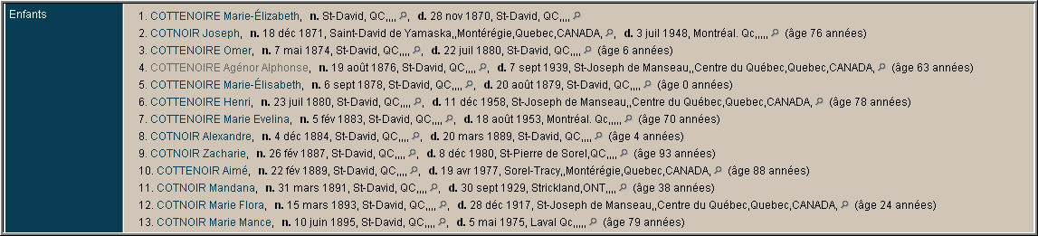 En 1881, la famille de Joseph Quotenoire et Élisabeth Letendre vit à Saint-David et est inscrite sous le nom de Cottenoir.