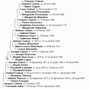 Voici mon ascendance… Je suis un fier descendant d’Antoine Cottenoyre, arrivé en Nouvelle-France à une date toujours indéterminée et qui épousa une jeunes fille de 16 ans du nom de Marguerite Provencher en avril 1682 au Cap-de-la-Madeleine.